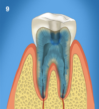 The entrance is temporarily closed with Cavit. Depending on the morphology and location of the canals, the sensitizer will penetrate into all micro-channels within 7-48 hours. To ensure sufficient concentration of sensitizer in this region, it is often necessary to re-apply sensitizer three to four times at an interval of two to four days. herefore, the access cavity must be reopened to renew the cotton pellet. The clinical symptoms such as chewing or knocking sensitivity show clear remission after the 2nd to 3rd irradiation (fig. 8).