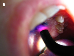 An access cavity located near the former pulp cavity is created. Then a small cotton pellet is inserted in the entrance and filled with Photolase sensitizer. Afterwards, the coloring deposit will be irradiated without contact using Alna-Medicalsystem collimated handpiece. (fig. 7).
